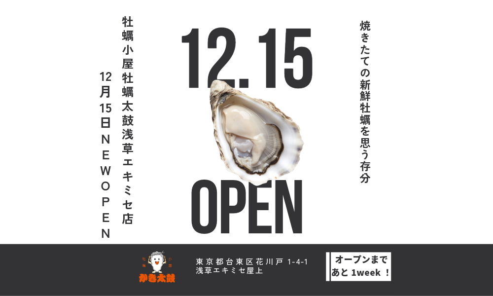 12月15日(月)牡蠣小屋かき太鼓浅草エキミセ店まもなくオープン!